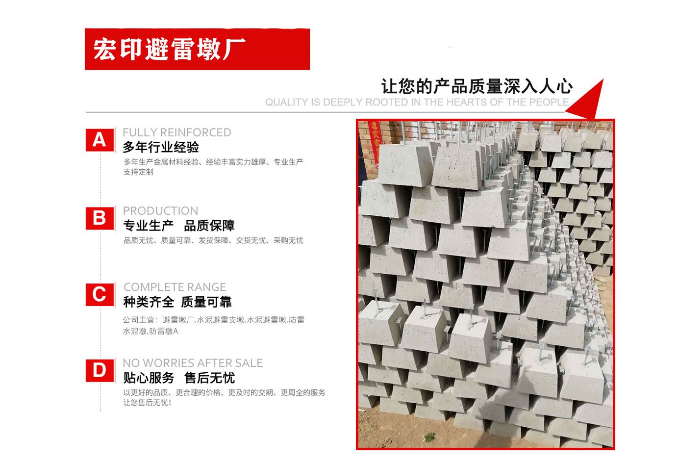 宏印避雷墩廠是一家以交通設施為主導,集設計、開發、生產、銷售于一體的設施公司,專業生產避雷墩廠,水泥避雷支墩,水泥避雷墩,防雷水泥墩,防雷墩等各種產品,并配備了原材料和產品測試中心等先進的檢測設備。公司產品已通過ISO9001國際質量體系認證,暢銷全國,與多家企業達成良好戰略合作,并廣泛用于道路,高速公路,市政工程的建設,改造,維護等工程?! ≈爻兄Z守信用是公司永恒的追求,我們崇尚“以質量求生存,以服務求信譽”的經營理念,秉承“謹慎做事,精益求精”的企業宗旨,客戶大小一樣熱情,業務忙閑一樣耐心、送貨多少一樣周到,新老客戶一樣誠懇。 我們也將繼續與交通行業的科研單位合作,加大研發新產品的力度,為廣大客戶和合作伙伴提供更優質的產品和更完善的服務保障,和社會各界朋友共同攜手為中國交通安全事業的輝煌明天和領跑行業邁向更高端市場而努力奮斗?! ≡谶@里我們將為您提供優質的產品和最專業的服務。誠信、互利、共謀發展。品質保證,物美價廉!公司全體員工熱誠歡迎社會各界朋友來公司洽談合作,共同發展!...